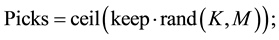 players=ceil(keep*rand(Ntourn,M)); [c,pt]=min(value(players));